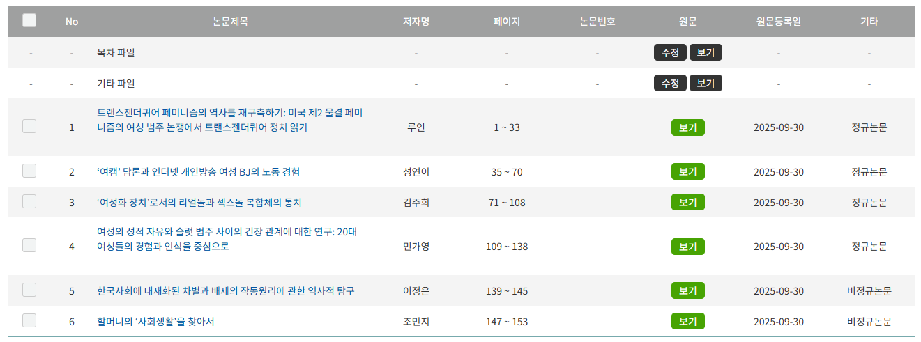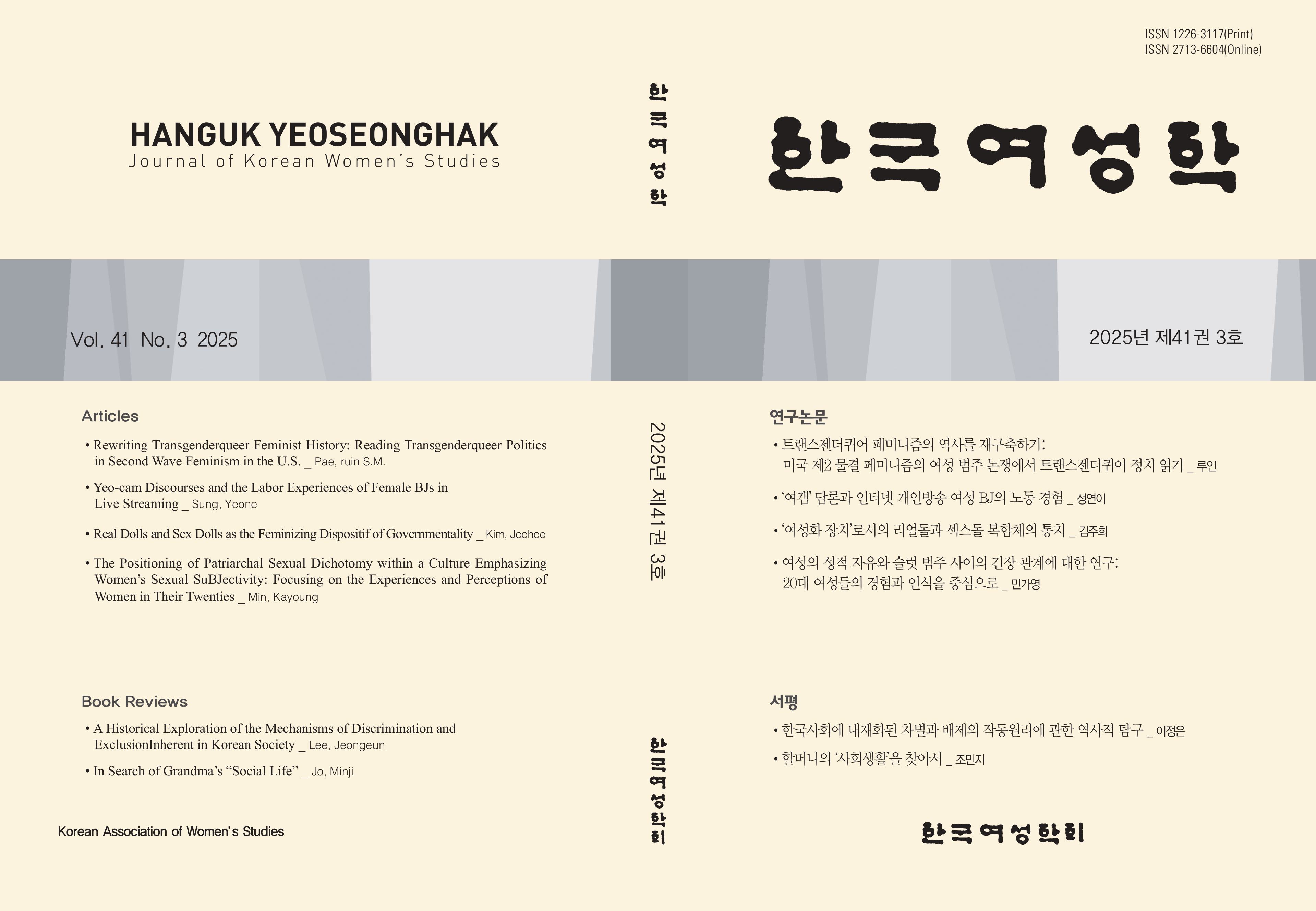 [논문2] ‘여캠’ 담론과 인터넷 개인방송 여성 BJ의 노동 경험 [논문3] ‘여성화 장치’로서의 리얼돌과 섹스돌 복합체의 통치 [논문4] 여성의 성적 자유와 슬럿 범주 사이의 긴장 관계에 대한 연구: 20대 여성들의 경험과 인식을 중심으로 [서평1] 한국사회에 내재화된 차별과 배제의 작동원리에 관한 역사적 탐구 [서평2] 할머니의 ‘사회생활’을 찾아서