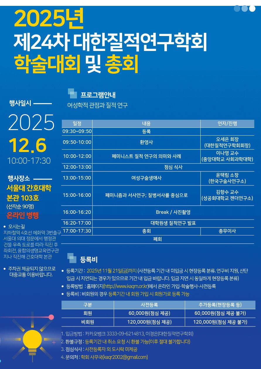 대한질적연구학회에서 춘계학술대회(12월 6일 토요일, 서울대 간호대학)를 여성학적 관점과 질적 연구라는 주제로 개최합니다.