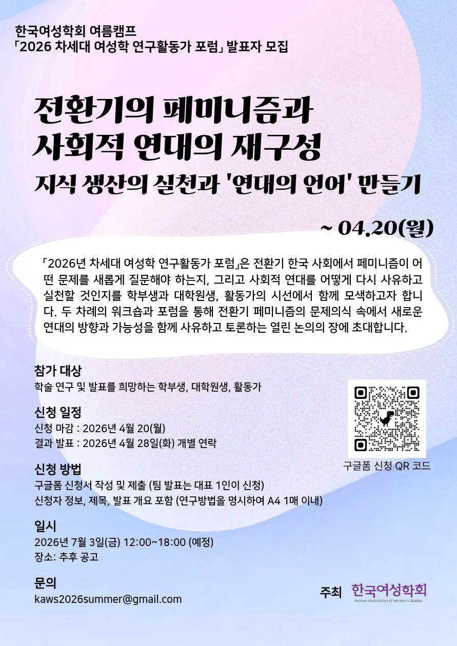 한국여성학회 여름캠프 「2026 차세대 여성학 연구활동가 포럼」의 발표자를 모집합니다.